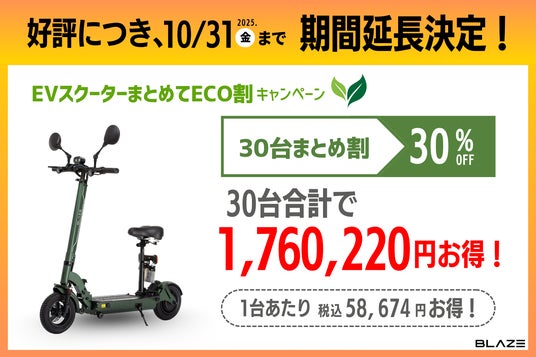 株式会社ブレイズ(愛知県名古屋市、代表取締役:市川秀幸、以下ブレイズ)は、2025年9月1日(月)より実施している「EVスクーターまとめてECO割キャンペーン」がご好評をいただいていることを受け、実施期間を10/31(金)まで延長することを決定いたしました。