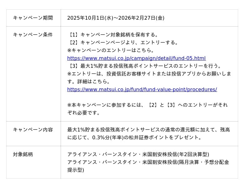 松井証券株式会社(本社:東京都千代田区、代表取締役 社長執行役員:和里田 聰、以下「当社」)は、2025年10月1日(水)より、「アライアンス・バーンスタイン・米国割安株投信」を対象に、「最大1%貯まる投信残高ポイントサービス増量キャンペーン」を実施します。