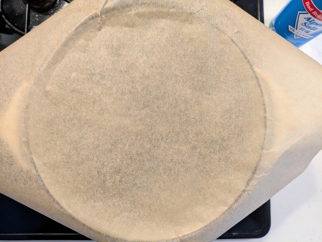 直径約18cmの鍋に、鍋底サイズに切ったオーブンペーパーを敷きます。