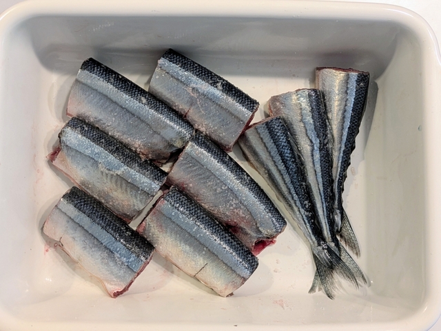 秋刀魚は頭を落として3等分の筒切りに。