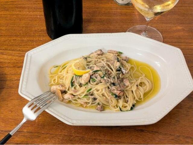 茹でたパスタにレモンを絞り、秋刀魚のコンフィをのせて。