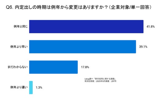 「例年と同じ」と回答した企業が最多の41.8%でした。次いで「例年より早い」と回答した企業が39.1%。内定出しの早期化が進んでいることが推察されます。