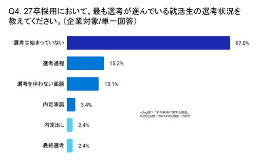 27卒採用で、最も選考が進んでいる就活生の選考状況を伺ったところ、全体の67.0%の企業が「選考は始まっていない」と回答しました。全体の約7割の企業が本選考を開始していないことがわかります。