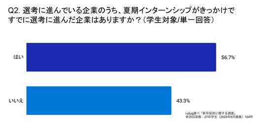 Q2. (Q1にて「はい」と回答した方以外に伺います。)選考に進んでいる企業のうち、夏期インターンシップがきっかけですでに選考に進んだ企業はありますか?(学生対象/単一回答)