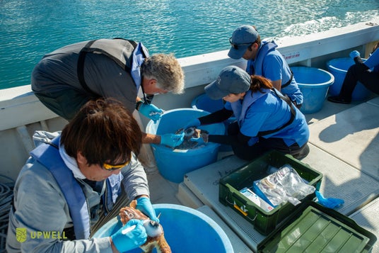 小型衛星タグを装着したアカウミガメの放流準備の様子(Photo by Upwell / Seawildearth)