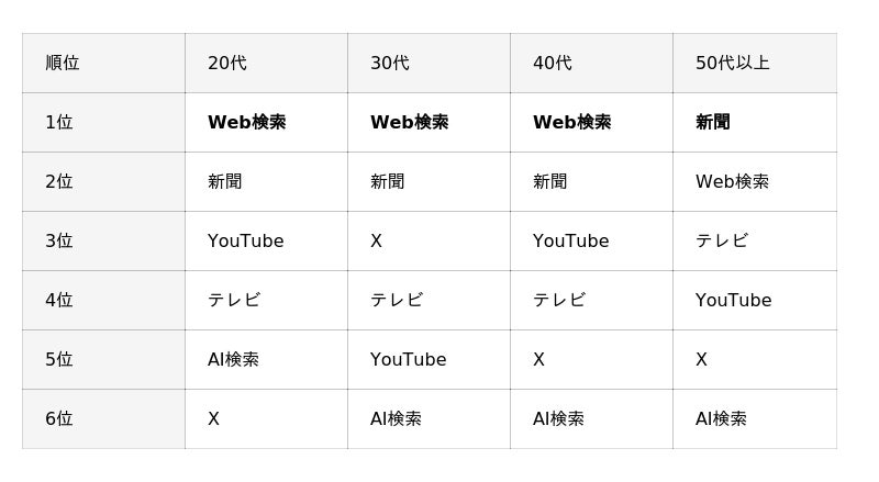 また、50代以上で新聞が1位となった背景には、情報収集の根本的な違いがあると考えられます。