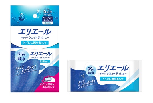 「エリエール ポケットウエットティシュー」は、通常品の約5分の1というコンパクトさで持ち歩きにぴったりな手の平サイズのウエットティシューです。それぞれ『エリエール ティシュー』、『エリエール トイレットティシュー』をミニチュア化したような、親しみやすくかわいらしいパッケージデザインとなっています。パッケージは小さくても、シートサイズは両手がしっかり収まる安心のサイズです。