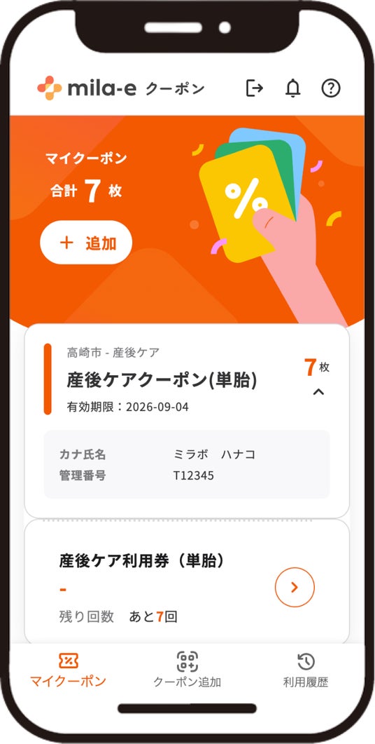 mila-e クーポンは、デジタルクーポンサービスです。産後ケアなどの デジタルクーポン・回数券を発行し、 利用状況をリアルタイムで確認できます。