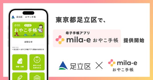 自治体向けサービスを開発する株式会社ミラボ(本社:東京都千代田区、代表取締役:谷川一也、以下「ミラボ」)の母子手帳アプリ「mila-e(ミライー) おやこ手帳」が、東京都 足立区に導入され、「足立区おやこ手帳」として 提供を開始しました。