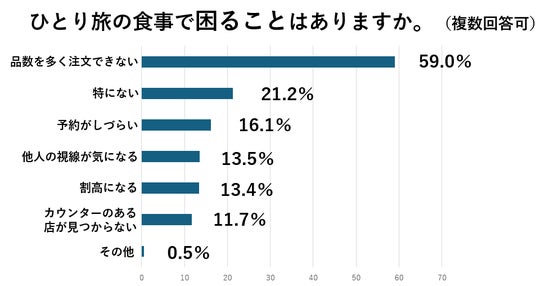 家族や友人たちと出かける旅行とは違い、ひとり旅ならではの食事の苦労も。最も多く挙がったのが「品数を多く注文できない」といった意見。地元の物を多く楽しみたくてもひとりだと限界が。他には予約がしづらい、他人の目が気になる、割高になる、といった意見も。