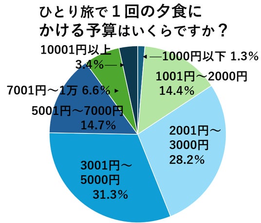 ひとり旅時の夕食については、やはりランチより多めの金額となりました。最も多かったのは、30%程の割合で3001~5000円、続いては僅差の割合で2001~3000円と回答した方でした。夕食の場合は、3.4%の方が10000円以上使うとの回答でした。