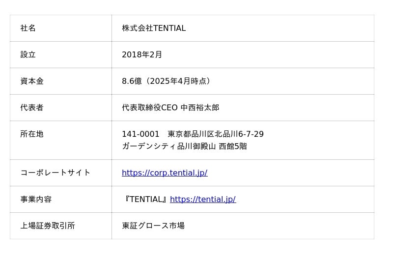 株式会社TENTIALは、「健康に前向きな社会を創り、人類のポテンシャルを引き出す。」をミッションに掲げ、コンディショニングブランド『TENTIAL』を運営しています 。代表取締役CEO中西裕太郎は、プロサッカー選手を目指した高校時代に病気で夢を絶たれた原体験から、自身のポテンシャルを最大限に発揮するためには健康と日々のコンディショニングが不可欠であると痛感 。この経験から株式会社TENTIALを創業し、世の中に「コンディショニングを実装する」ことを目指しています。コンディショニングブランド『TENTIAL』は、アスリートの知見と最新技術・研究に基づき、機能性を追求した製品・サービスを提供。24時間365日、日常生活のあらゆるシーンで心身を整え、疲労回復やパフォーマンス向上をサポートするコンディショニング活動を推進しています 。すべては個人のコンディションとポテンシャルを引き出すという信念のもと、株式会社TENTIALは、健康に前向きな社会の実現のため、コンディショニングの社会実装に取り組んでまいります。