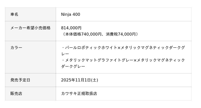 株式会社カワサキモータースジャパン(本社:兵庫県明石市、代表取締役社長:佐伯 健児)は、「Ninja 400」のカラー&グラフィックを変更し、2025年11月1日(土)に発売いたします。
