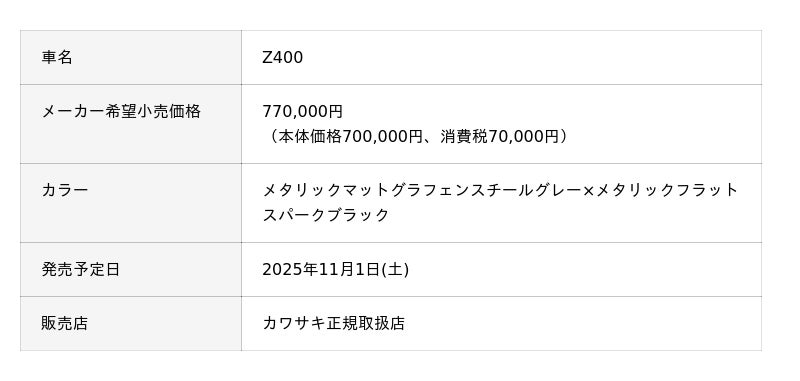 株式会社カワサキモータースジャパン(本社:兵庫県明石市、代表取締役社長:佐伯 健児)は、「Z400」のカラー&グラフィックを変更し、2025年11月1日(土)に発売いたします。