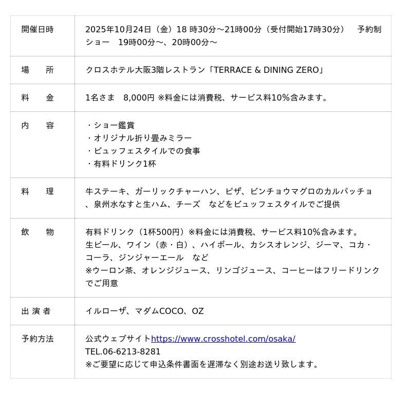 クロスホテル大阪(所在地:大阪市中央区、総支配人:水谷 之則)のレストラン「TERRACE & DINING ZERO」では今年で第3弾を迎える「HALLOWEEN NIGHT with DRAG QUEEN」を2025年10月24日(金)に開催します。