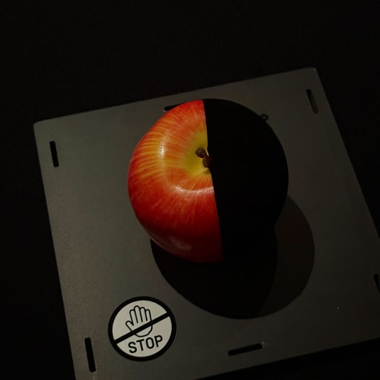暗素研の世界一黒い塗料「黒色無双」が塗られたリンゴ模型。光を反射しないので立体感がゼロに。