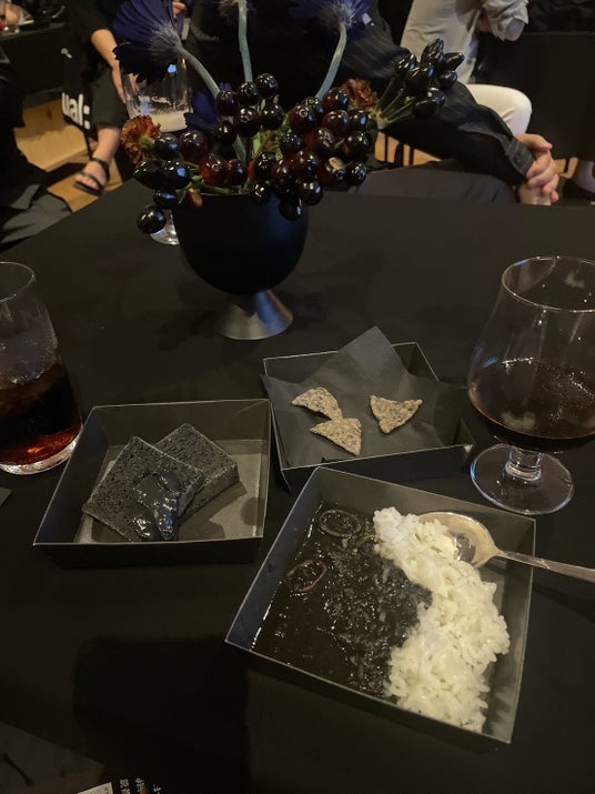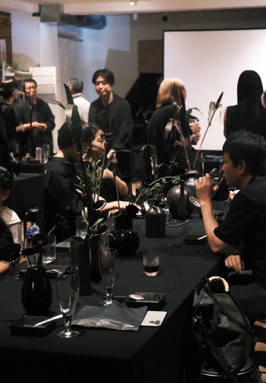 テーブルも装花も黒。研究員は黒衣に身を包み、ゲストの方も黒いファッションと、会場内は見渡す限り真っ黒に。