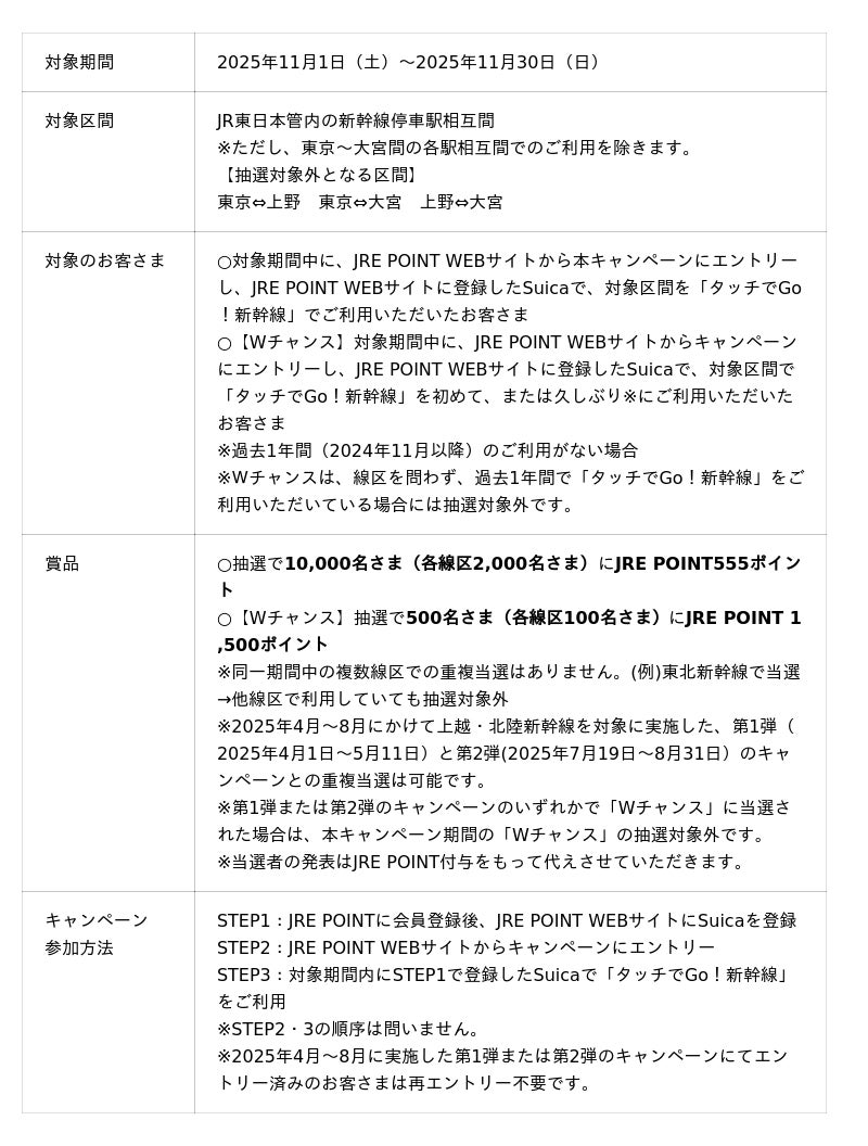 ○東北、秋田、山形、上越、北陸新幹線のJR東日本区間において「タッチでGo!新幹線」をご利用いただいたお客さまを対象に、抽選で10,000名さま(各線区2,000名さま)にJRE POINT555ポイントをプレゼントするキャンペーンを実施します。