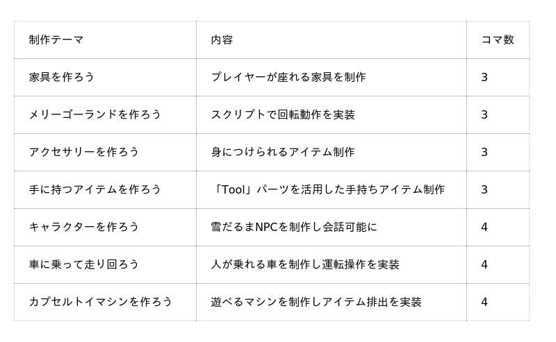 ・対象者:小学3年生以上(Roblox入門・Blender入門修了者)・内容:最初の3コマはプログラミングを行わず、Blenderモデリングに集中。Roblox Studioへの取り込みや、スクリプトを加えた動きの実装を段階的に学習。