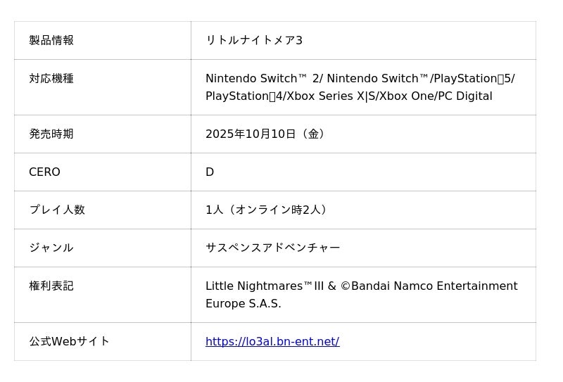 ■『リトルナイトメア3』公式サイトはこちら:https://lo3al.bn-ent.net/
