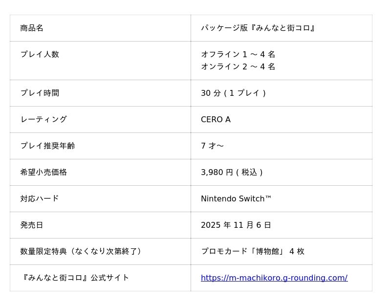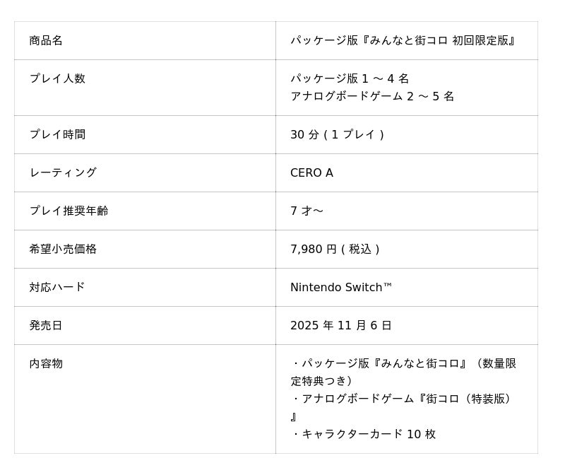 グランディング株式会社(本社:福岡市中央区 代表取締役 CEO : 二木 幸生)は、 2025 年 11 月 6 日の Nintendo Switch(TM) パッケージ版 『みんなと街コロ』発売を記念して、アナログボードゲーム『街コロ』大会を JELLY JELLY CAFE にて開催することをお知らせいたします。
