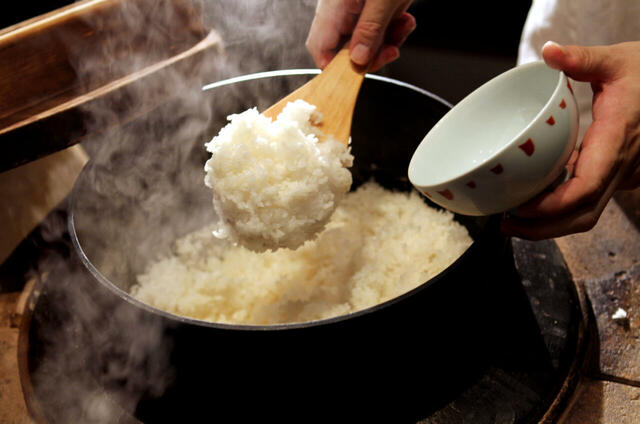 同店のご飯は、新潟県長岡産のこしひかり・こしいぶきをブレンドし、毎朝精米したての米を仕入れ、とぎ方、炊き方、蒸らし方、火加減などにこだわって、店内に据えられた150kgの大かまどで炊きあげているもの。