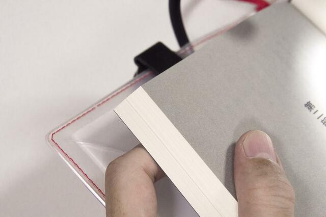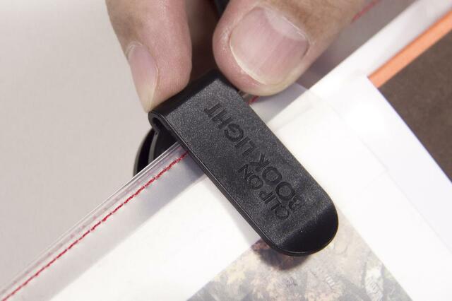 クリップでハードカバーの背表紙をはさんで本を開くと。