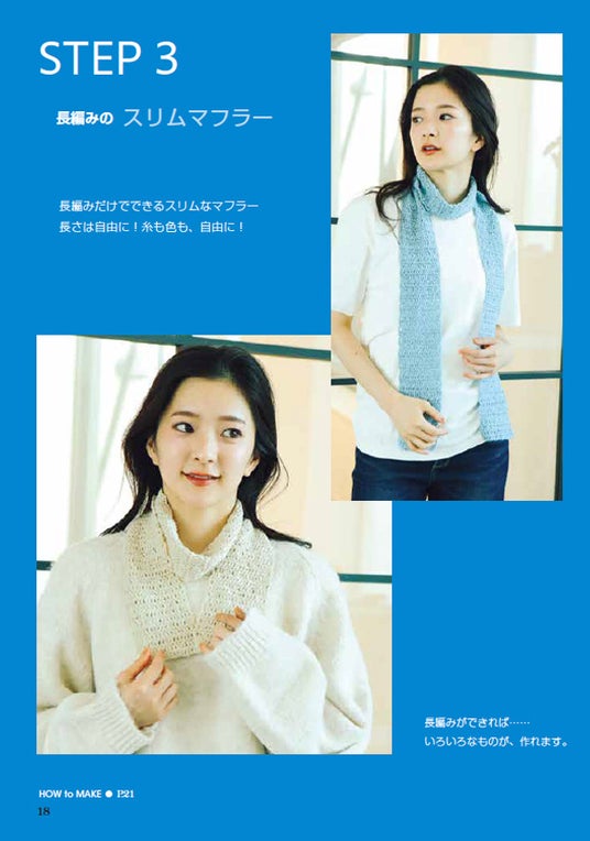 STEP3で「長編み」をレッスン。バリエーションでは「中長編み」「長々編み」も登場します。