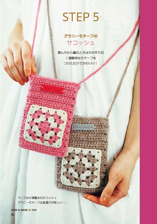 STEP5「わの作り目」をマスターしてモチーフを編みましょう。人気のグラニーモチーフが編めるようになります。STEP6では「増し目」を覚えて立体的なバケットハット、STEP7では「減らし目」を使ったイヤーマフを編みます。編みたい作品を編むのではなく、順番に基礎から練習すること。これが帽子やモチーフ編みの作品など、編んでみたいものを思ったようにちゃんときれいに編める一番早い方法です。モチーフが編めるようになったらつなげてベストにも。