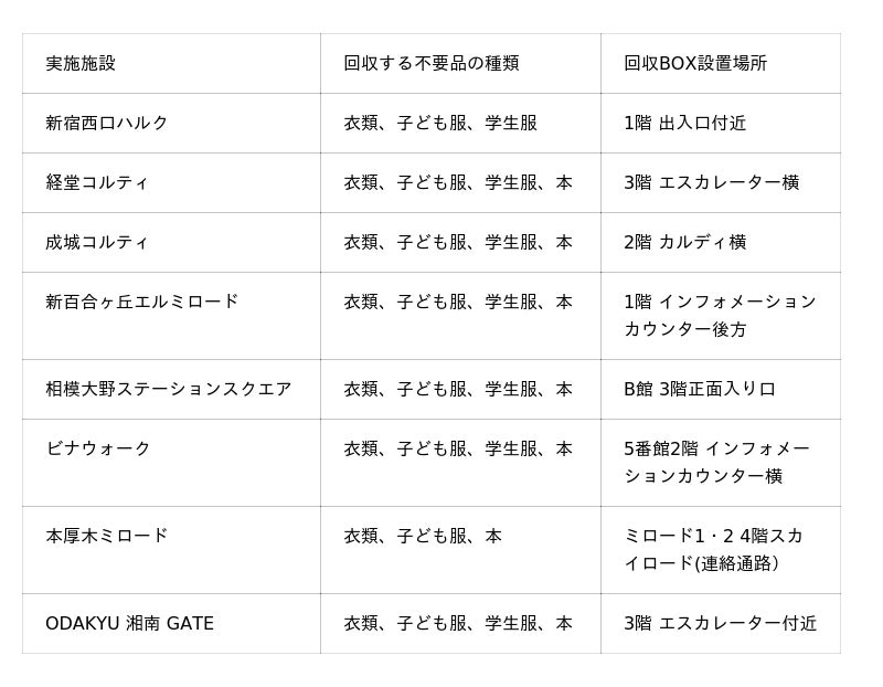 お客さまがご家庭で不要になった衣類や本などを、小田急沿線の8つの商業施設に設置した回収ボックスにて回収(不要品回収サポート:株式会社小田急ビルサービス)、集まった不要品を協力会社(ブックオフコーポレーション株式会社・学生服リユースShopさくらや・株式会社REGATE[ふくちゃんリユスタ])の3社で査定。その査定額を元に「子育て応援」や「地域課題の解決」をテーマとしたギフトを、各施設が立地する自治体に寄贈します。ぜひこの機会に ご家庭の不要品を各施設へお持ちください。