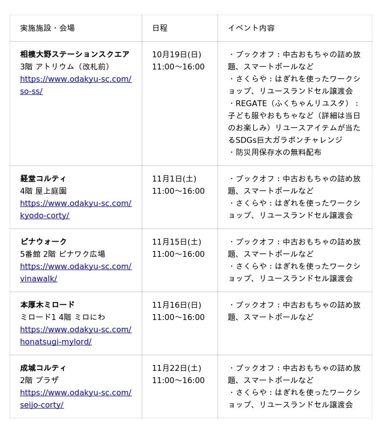 実施施設:新宿西口ハルク、経堂コルティ、成城コルティ、新百合ヶ丘エルミロード、相模大野ステーションスクエア、ビナウォーク、本厚木ミロード、ODAKYU 湘南 GATE