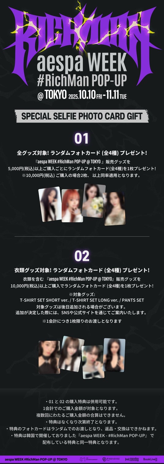 1.全グッズ対象!ランダムフォトカード(全4種)プレゼント『aespa WEEK #RichMan POP-UP @TOKYO』販売グッズを5,000円(税込)以上ご購入ごとにランダムフォトカード(全4種)を1枚プレゼントいたします。