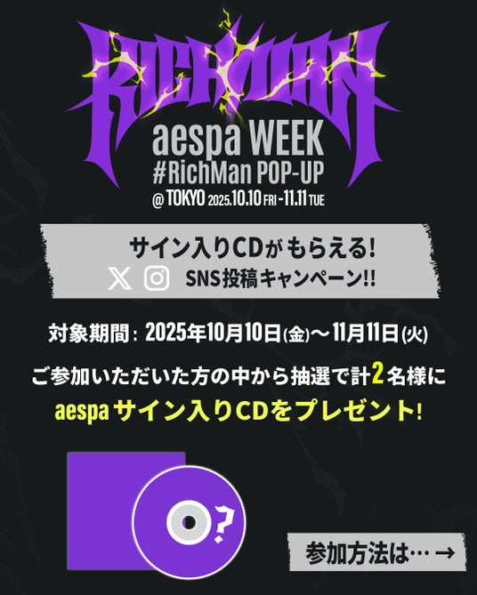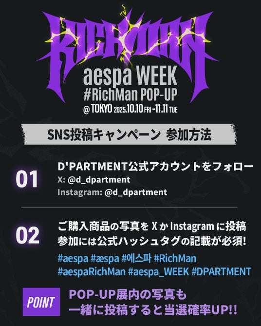 『aespa WEEK #RichMan POP-UP @TOKYO』開催中、店頭で商品をご購入いただいたお客様を対象に、SNS投稿キャンペーンを開催いたします。