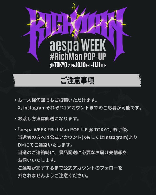 『aespa WEEK #RichMan POP-UP @TOKYO』終了後、当選者の方にのみ、D'PARTMENT公式SNSアカウント(XまたはInstagram)よりダイレクトメッセージにてご連絡いたします。当選のご連絡時に、景品発送に必要なお届け先情報をお伺いいたします。※DM受信設定の確認をお願いいたします。