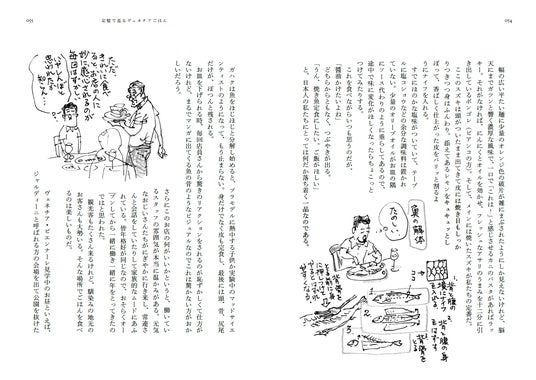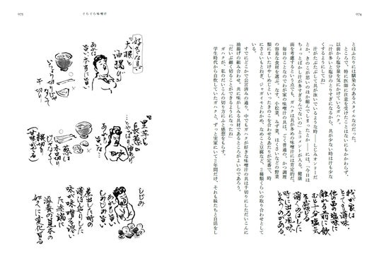 題材となる食体験を共有した二人、夫婦合作であるからこその文と画の一体感とライブ感を、ページを繰るたび味わえます。一方で、山口氏が挿画の中で自身の内なる声(梅村氏へのツッコミも少々)を表現するところもチラホラ。妻目線の文章と、それに呼応する夫目線の挿画&コメントの両方を楽しめるところが、本書の大きな魅力となっています。