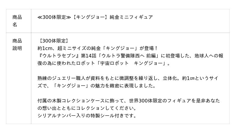 このたびの新作は『ウルトラセブン』第14話「ウルトラ警備隊西へ 前編」に初登場した「宇宙ロボット キングジョー」の純金フィギュアです。熟練のジュエリー職人が資料をもとに微調整を繰り返し約1cmのミニサイズながら、「キングジョー」の魅力を緻密に表現しました。
