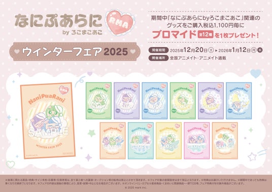 全国アニメイト・アニメイト通販にて2025年12月20日から2026年1月12日まで開催される、「なにぷあらにbyろこまこあこ」ウィンターフェア2025では、期間中、関連グッズを1,100円(税込)お買い上げ毎に、1枚ブロマイドをプレゼントいたします。ブロマイドの種類は全部で12種。