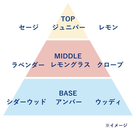 気持ちのゆらぎを考えた香りラベンダー、ジュニパー、セージなどリラックス感のあるハーブに、クローブやアンバーの柔らさが合わさり、温もりある心落ち着く印象に仕上げたハーバルシトラス調の香りです。