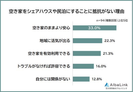 「空き家をシェアハウスや民泊にすることに抵抗がない」と答えた94人に理由を聞いたところ、1位は「空き家のままより安心(33.0%)」でした。以下、2位「地域に活気が出る(22.3%)」、3位「空き家を有効利用できる(21.3%)」が続きます。