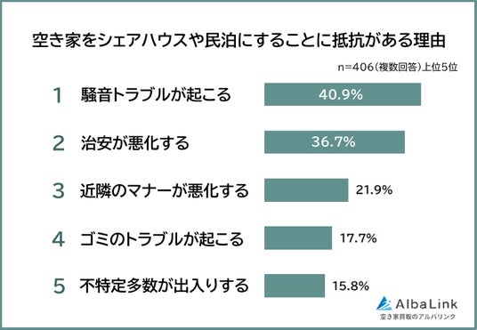 「空き家をシェアハウスや民泊にすることに抵抗がある理由の第1位は「騒音トラブルが起こる(40.9%)」。次ぐ2位は「治安が悪化する(36.7%)」、3位は「近隣のマナーが悪化する(21.9%)」でした。