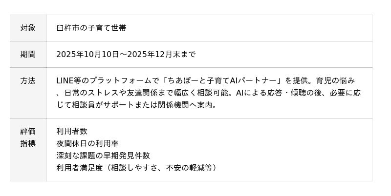 つながりAI株式会社(東京都港区、代表取締役:駒崎弘樹)は、臼杵市と連携し、2025年10月10日より子育て世帯を対象とした相談AI「ちあぽーと子育てAIパートナー」の実証実験を開始します。