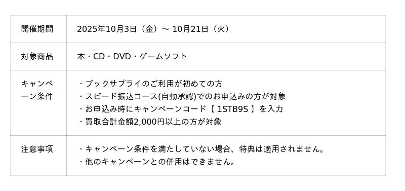 株式会社ブックサプライ(本社:大阪府吹田市、代表取締役:藪田真吾)は、2025年10月3日(金)~10月21日(火)の期間限定で、ブックサプライを初めてご利用になる方を対象とした「買取金額5%UPキャンペーン」を実施いたします。