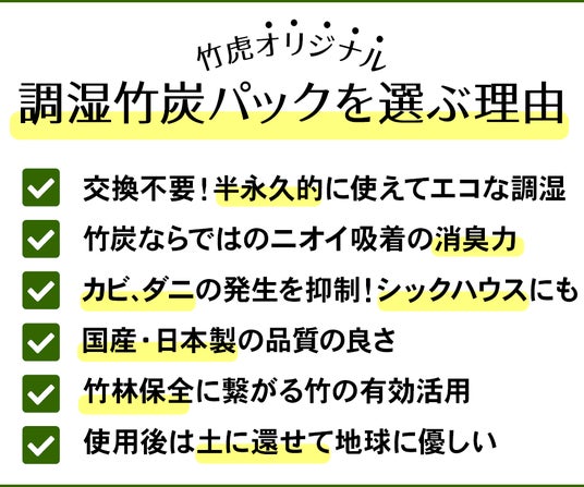 創業明治27年(1894年)より竹材・竹製品製造卸業として皆様にご愛顧いただいている竹材専業メーカーである、虎斑竹専門店 竹虎(運営:株式会社山岸竹材店)は、竹炭の魅力をより多くのお客様に実感していただくため、衣替えにも重宝する調湿竹炭パックの対象商品をご購入の方に、さらに「調湿竹炭パック(小)」1点をプレゼントする特別キャンペーンを2025年10月4日(土)20:00~23:59限定で実施いたします。