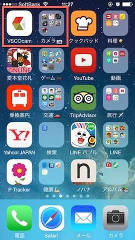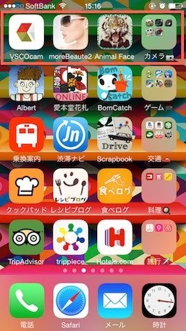 たとえば、こちらの壁紙を使って、横ラインで同じジャンルのアプリを集めてみます。1列目はカメラアプリを3つ並べて、一番右端にカメラフォルダを置きます。これを列ごとにジャンルを変えて置いていきます。よく使う3つのアプリはフォルダの外に、あとの残りはフォルダの中に入れておくことができます。