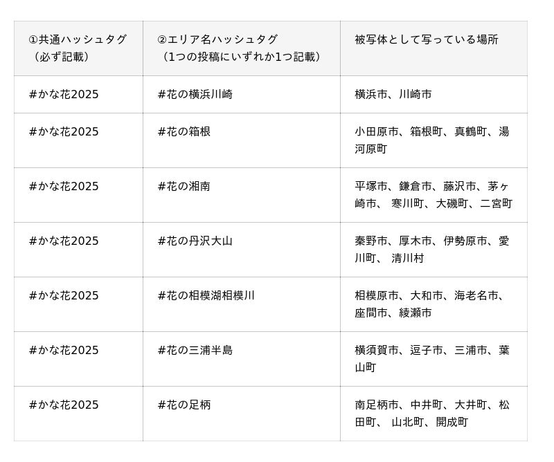 (2) 2つのタグ(1.共通ハッシュタグ「#かな花2025」、2.エリア名ハッシュタグ「#花の(エリア名)」)を付け、インスタグラムへ投稿