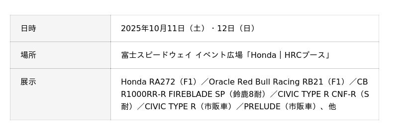 Honda F1初勝利から60周年を記念して、初優勝をもたらした「Honda RA272」に加えて、時代を継承するF1マシン「Oracle Red Bull Racing RB21」の他、「CBR1000RR-R FIREBLADE SP」「PRELUDE」を展示!