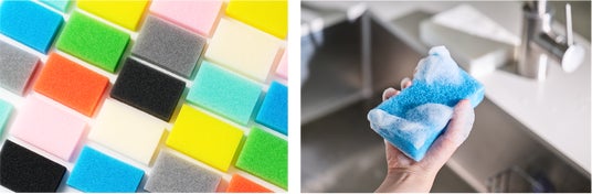 ダイニチ・コーポレーションは創業から、食器洗い用固形洗剤の製造販売を行っています。製造から販売を行う中で、固形洗剤と相性の良いスポンジを研究し、高品質ポリウレタンを使用した、従来のスポンジの概念を覆す「サンサンスポンジ」が生まれました。半年以上使えるほど丈夫で長持ちなので、ごみの削減に。