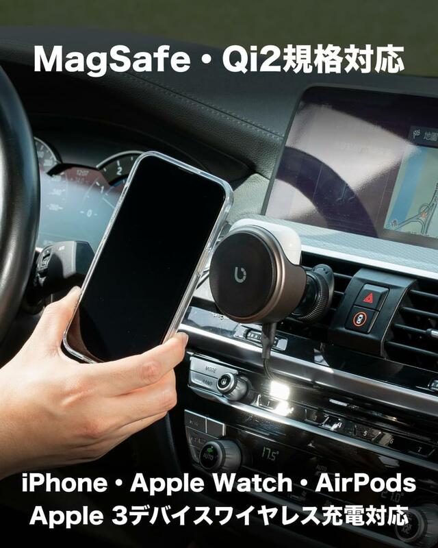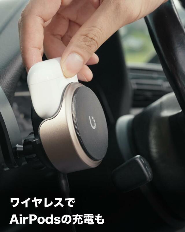 iPhoneの充電部は半透明のスモークブラックを採用。うっすらと浮かび上がるコイルやマグネットがカッコよく、車内インテリアとしても活躍。