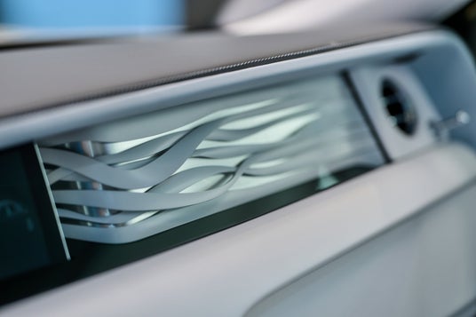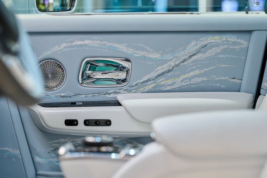 エクステリアはビスポークのツートーン仕上げで、ボディ上部にはアンダルシアン・ホワイト、下部には「サモトラケのニケ」の由来となったサモトラケ島を囲む海の色から着想を得たトラキアン・ブルーが配されています。繊細なメタリックフレークが海面を照らす太陽光の輝きを模しており、手塗りのダブルコーチラインとスピリット・ブルーのホイール・ピンストライプが、優雅なエクステリアを完成させています。インテリアには、スピリット・オブ・エクスタシーの表情豊かで躍動感のある姿にインスピレーションを得た、さまざまなデザイン要素、質感、連続的なグラフィックで彩られています。光沢のあるツイル生地仕立ての優雅なビスポークの刺繍、スピリット・オブ・エクスタシーのエレガントな躍動感を捉えた精緻なギャラリーのアートワークやスターライト・ヘッドライナーがそのデザインの本質を見事に表現しています。