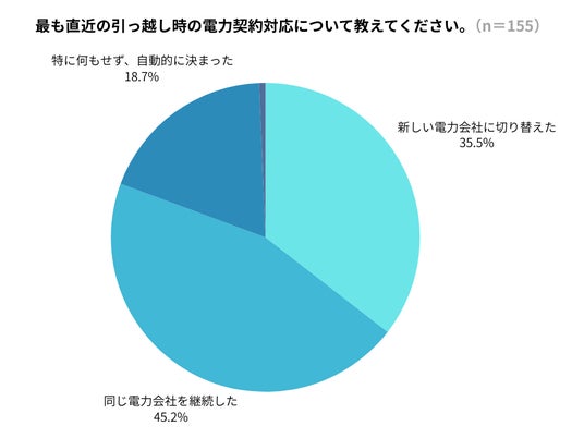 引越し時の電力契約対応について調査した結果、新しい電力会社に切り替えた人は55人(35.5%)でした。一方、同じ電力会社を継続した人は70人(45.2%)、特に何もせず自動的に決まった人も29人(18.7%)いることがわかりました。